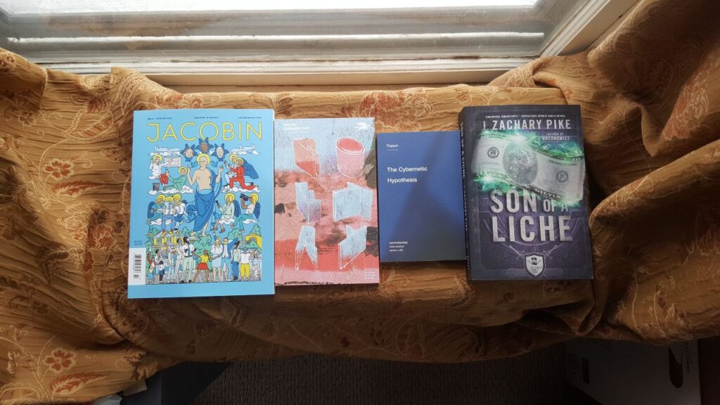 On the left (ha!) is the latest issue of Jacobin, a magazine which has only increased in importance since America’s slide into being a corporate fascist state was slowed slightly by the election of Joe Biden.