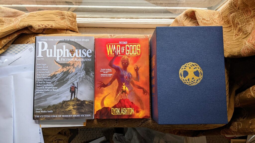 Next is War of Gods by Dyrk Ashton, in the limited edition hardcover, next to the box which fits the complete hardcover trilogy. I have been a fan of Dyrk’s work since I first met him at ConFusion back in…2016? He had just published the first volume of his Paternus trilogy. The completion of the hard-cover boxed set feels like the end of an era, and I have heard rumors that Ashton is working on something new. Based simply on that rumor, I am already looking forward to reading it.