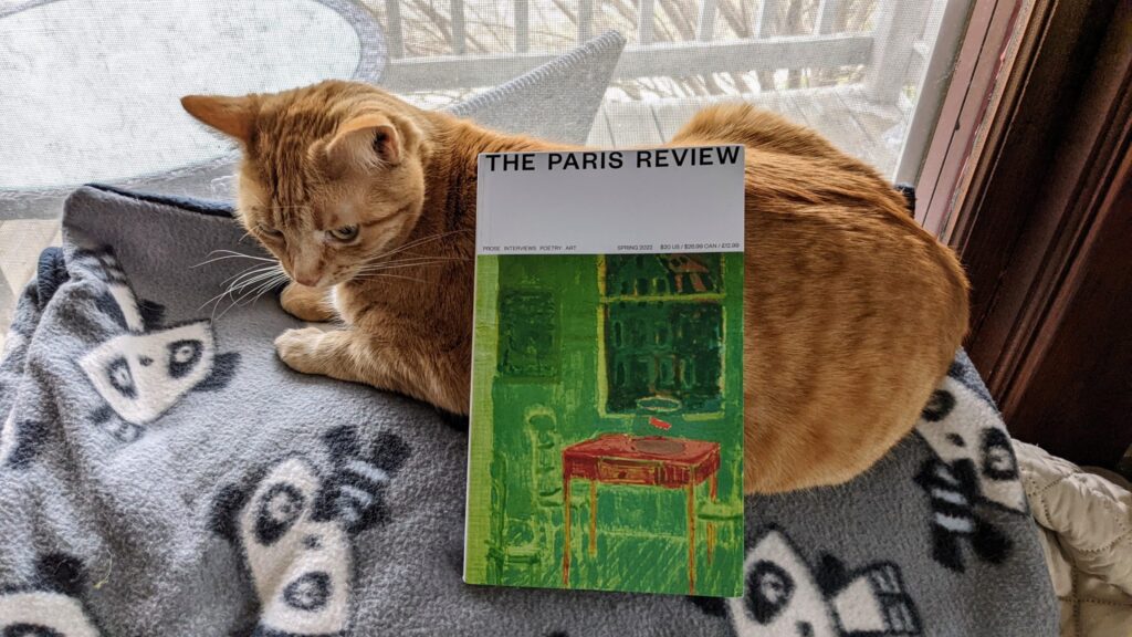 The new issue of The Paris Review was the only arrival this week. Poe is earning her keep as a book rest, atop her panda blanket as she watches the porch for squirrels and birds.