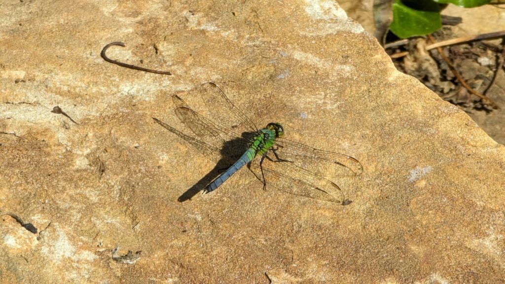 [A Green Darner dragonfly, soaking up the sunlight on our front steps.]