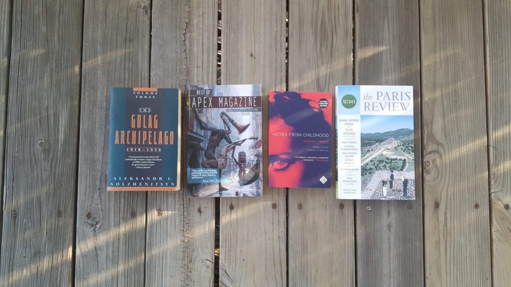 A small pile of books and periodicals arrived here in the past week. On the left is volume 3 of Aleksandr Solzhenitsyn’s The Gulag Archipelago. This was difficult to find, as it is a very specific volume 3 which is part of a set which was published in 1992. I picked up volumes 1 and 2 from the remainder shelf of Schuler Books and Music sometime around 1995. I kept hoping volume 3 would show up for cheap, and I left the bookstore in 1999 with that dream unfulfilled.