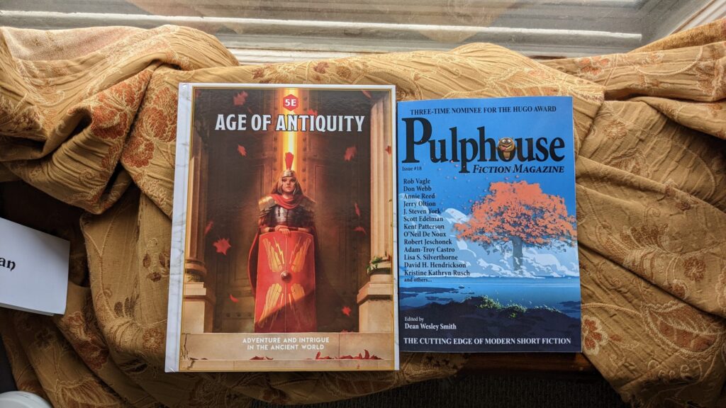 First up is Age of Antiquity, a d20 RPG supplement from a Kickstarter I backed in June of 2020. The printing and fulfillment process immediately fell afoul of the COVID-19 lockdowns and supply chain disruption, but the team persevered and finally, almost 18 months after the original fulfillment date, I have the book in my hands, and it is beautiful. This is also something of a relic of the beginning of the lockdown in 2020, when I thought I would have time to indulge in playing some RPGs, or at least reading manuals and designing adventures. That, of course, turned out to NOT be the case, but I do have several beautiful d20 rulebooks which I otherwise would never have considered.